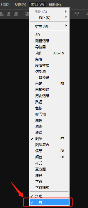 如果在打开PS后,没有显示或者是找不到的话,可以点击PS顶部菜单栏中的“窗口——工具”即可出现——