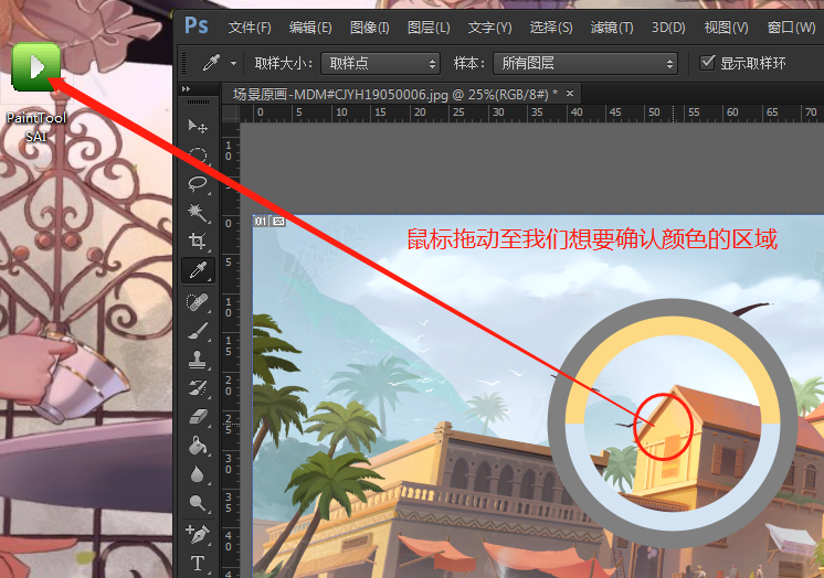 按住Alt键,或者点击吸管工具,在PS的图中鼠标左键点击一个位置,松手不动。然后拖动到PS外部我们想要寻找的地方上——