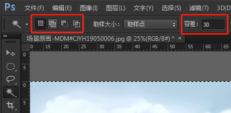 其中魔棒还可以选择选取的方式以及容差大小。如果你想多次使用魔棒进行选取的话,可以试试第二个标识,而容差的大小决定你的魔棒选择的精细程度——