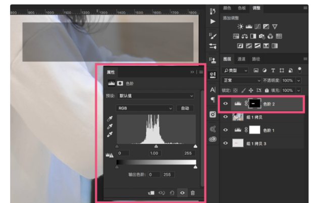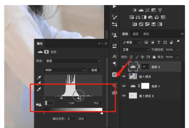 - 移动色阶右边的滑块,直到灰色方框消失为止。
